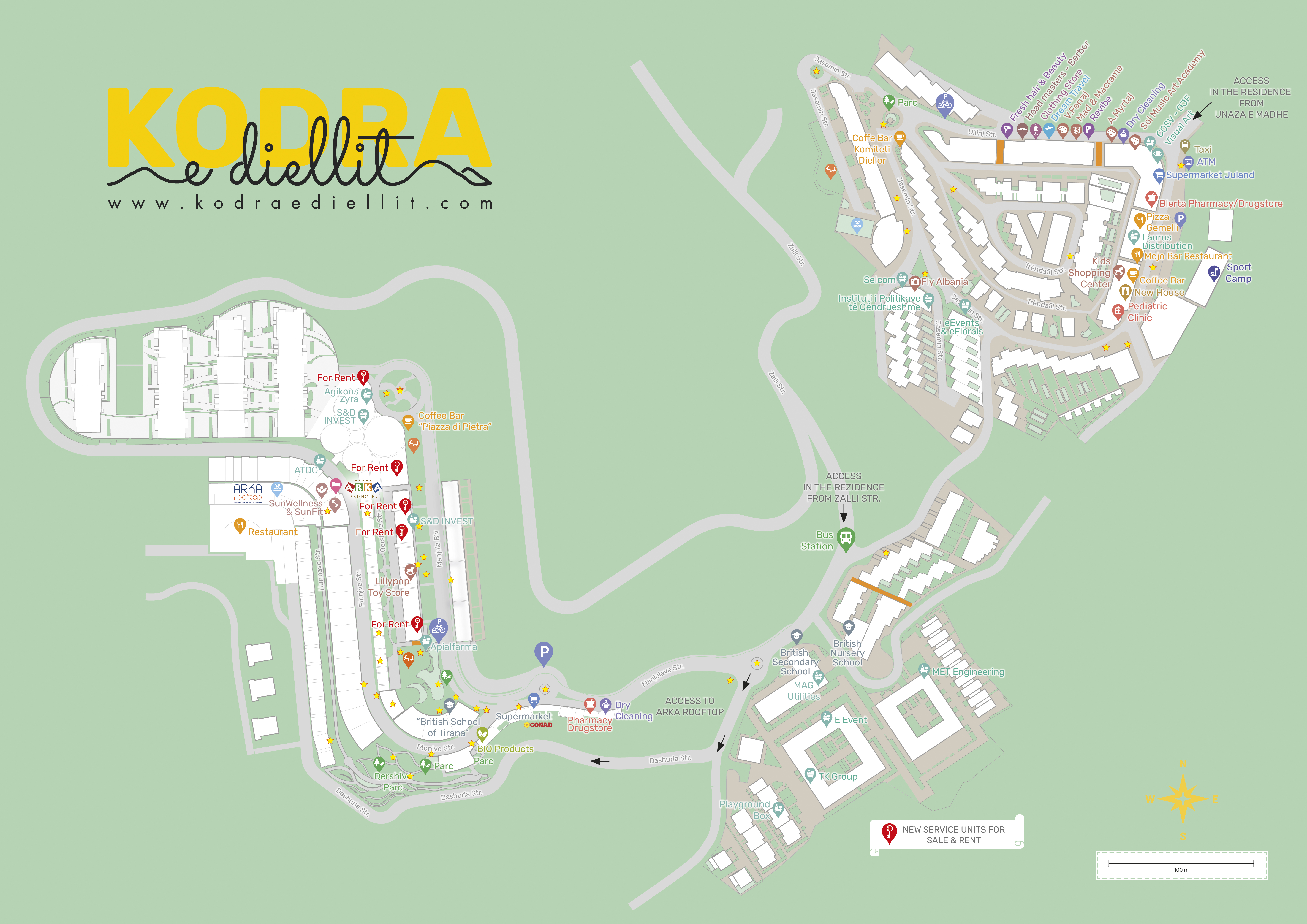 “Kodra e Diellit” is a project that was created to give the opportunity of escape from the city, but over the years, it has become a town where the needs of the residents are easily met inside the Residence. Various services at “Kodra e Diellit” Residence include supermarkets, clinics and pharmacies, nursery and school, bars, restaurants and patisseries, dry cleaning, swimming pools, gyms, hairdressers and Spa-s and even a clinic and a hotel for our friends with paws.